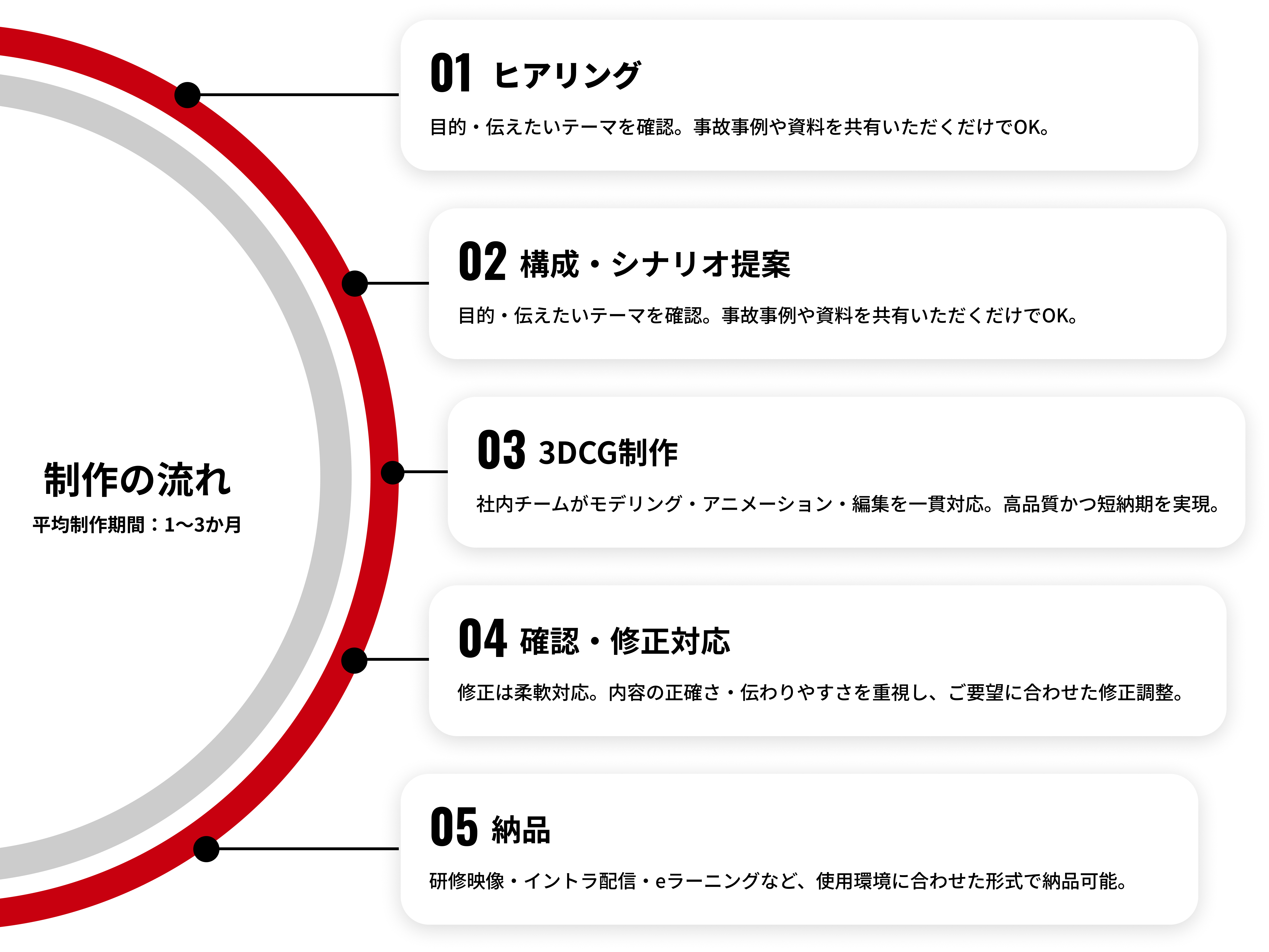「3DCGは難しそう」「専門知識が必要」と感じる方も多いかもしれません。ご安心ください。初めてでもスムーズ・シンプルに進行・納品いたします。お客様は、「制作目的・内容」と「関連資料」支給いただき、あとは私たちが制作した内容を「確認」していただくだけです。